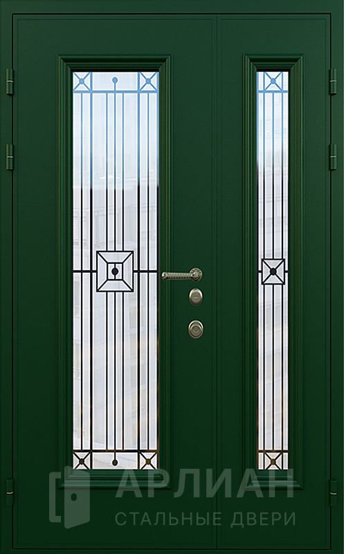 Фото «Двустворчатая входная дверь в частный дом со стеклом и решеткой №18»